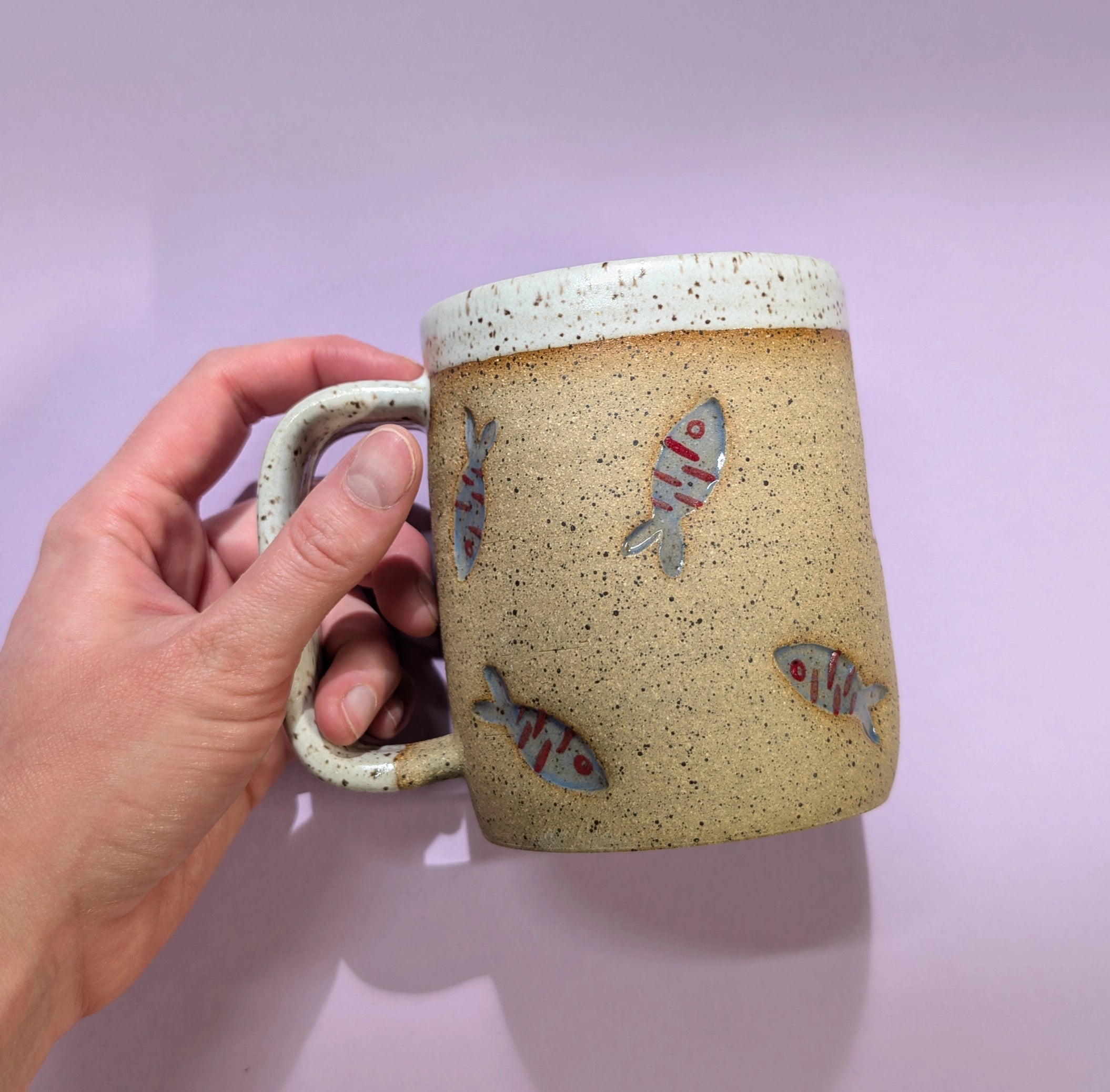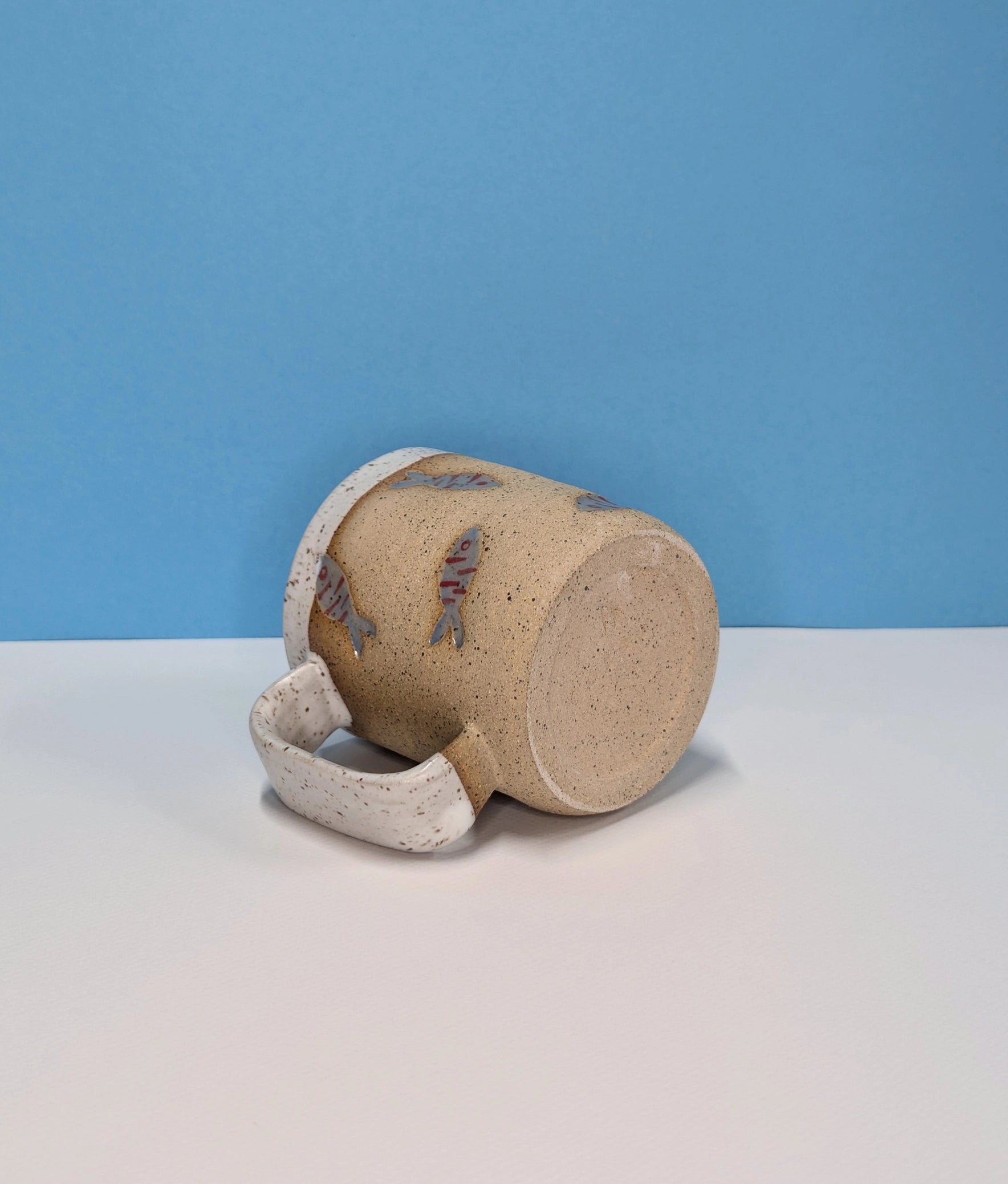 This handmade mug was thrown on the wheel and then stamped with my hand carved fish stamp! The fish is glazed in a light blue with red accents and is glossy. All mugs are dishwasher and microwave safe. They are all handmade so variation in pattern placement is expected, as is possible color differences, though they will be minor.
