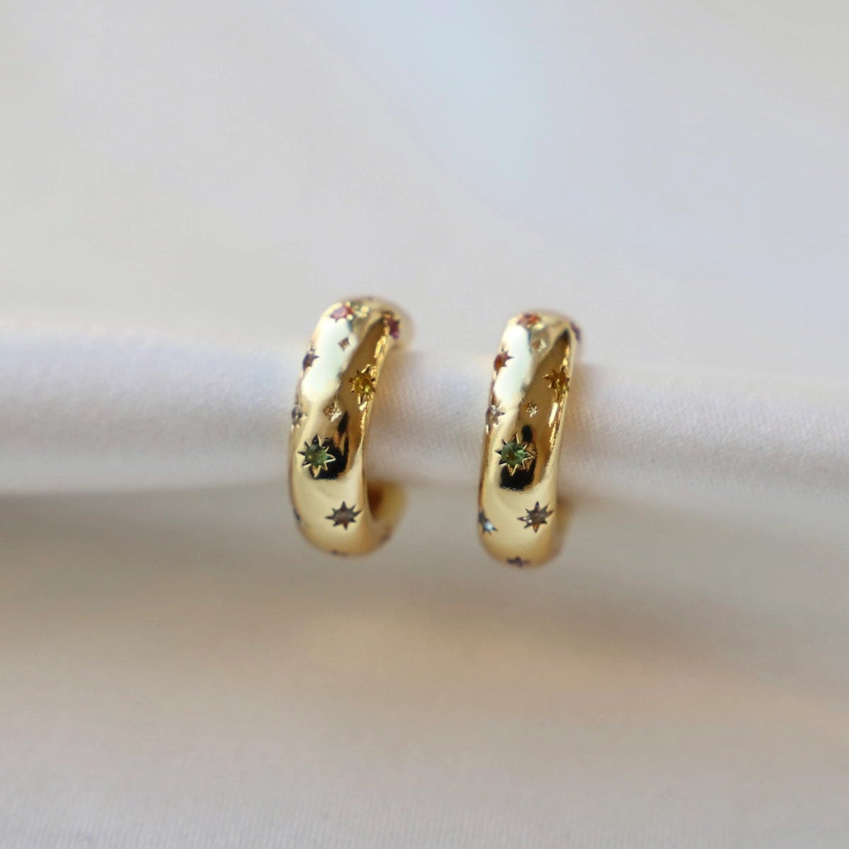 A small thick hoop with multi-colored CZ stars. These earrings are a fun twist on a classic gold hoop. The colored detailing is a subtle yet sparkly addition that you will love! Materials: Gold plated brass, sterling silver post, colored CZ