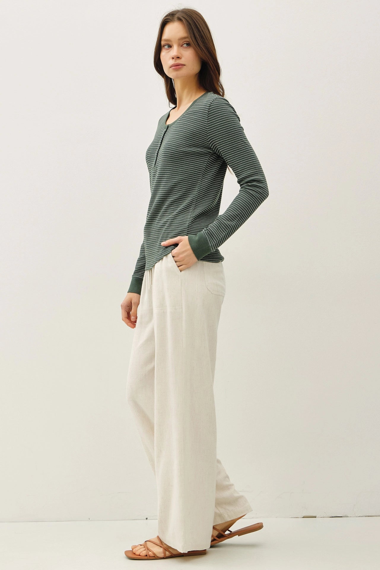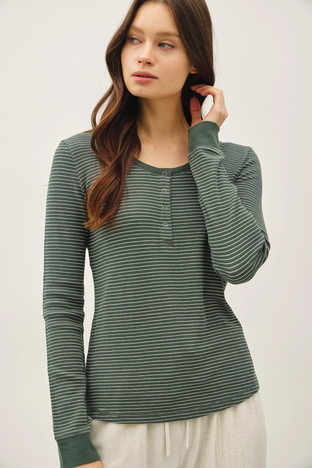 The Stitched Thermal Henley Top in Forest Green delivers refined construction with purposeful design details. This foundational wardrobe piece features a rounded henley neckline accented by contrast binding & coordinating cuff detailing on long sleeves. The fabric blend offers optimal stretch and softness for all-day wear, while the relaxed slim fit provides a modern silhouette without excess bulk. Perfect for layering versatility or standalone styling, this essential top performs across multiple occasions and seasons.