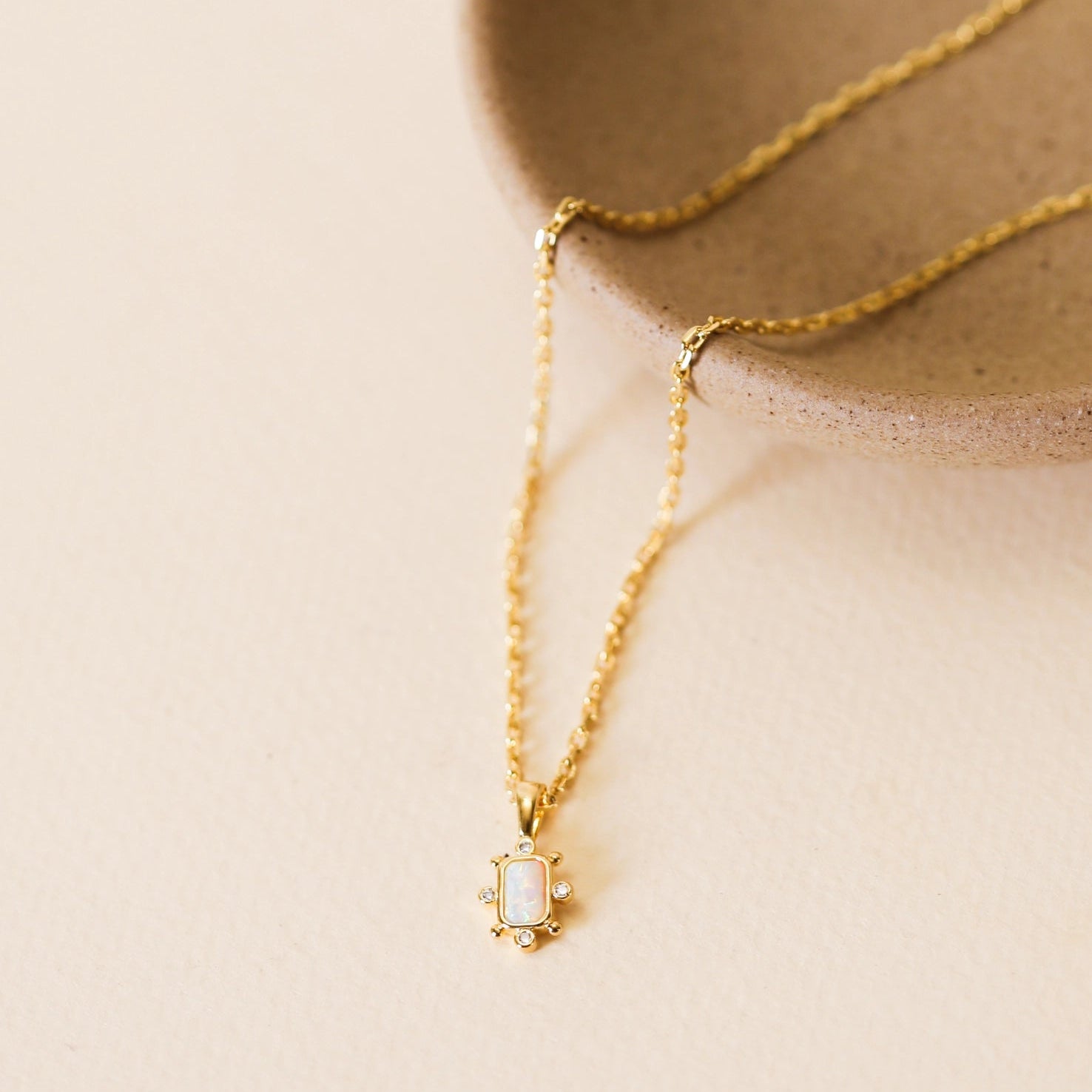A beautiful white opal stone set between 4 petite cz stones. Tarnish Free - Long lasting protective coating safeguarding your jewelry from sweat, water, and more. 5x more gold that standard 18k gold plating over brass Hypoallergenic – Lead Free Adjustable 16in to 18in Synthetic White Opal set inside 4 petite white CZ stones