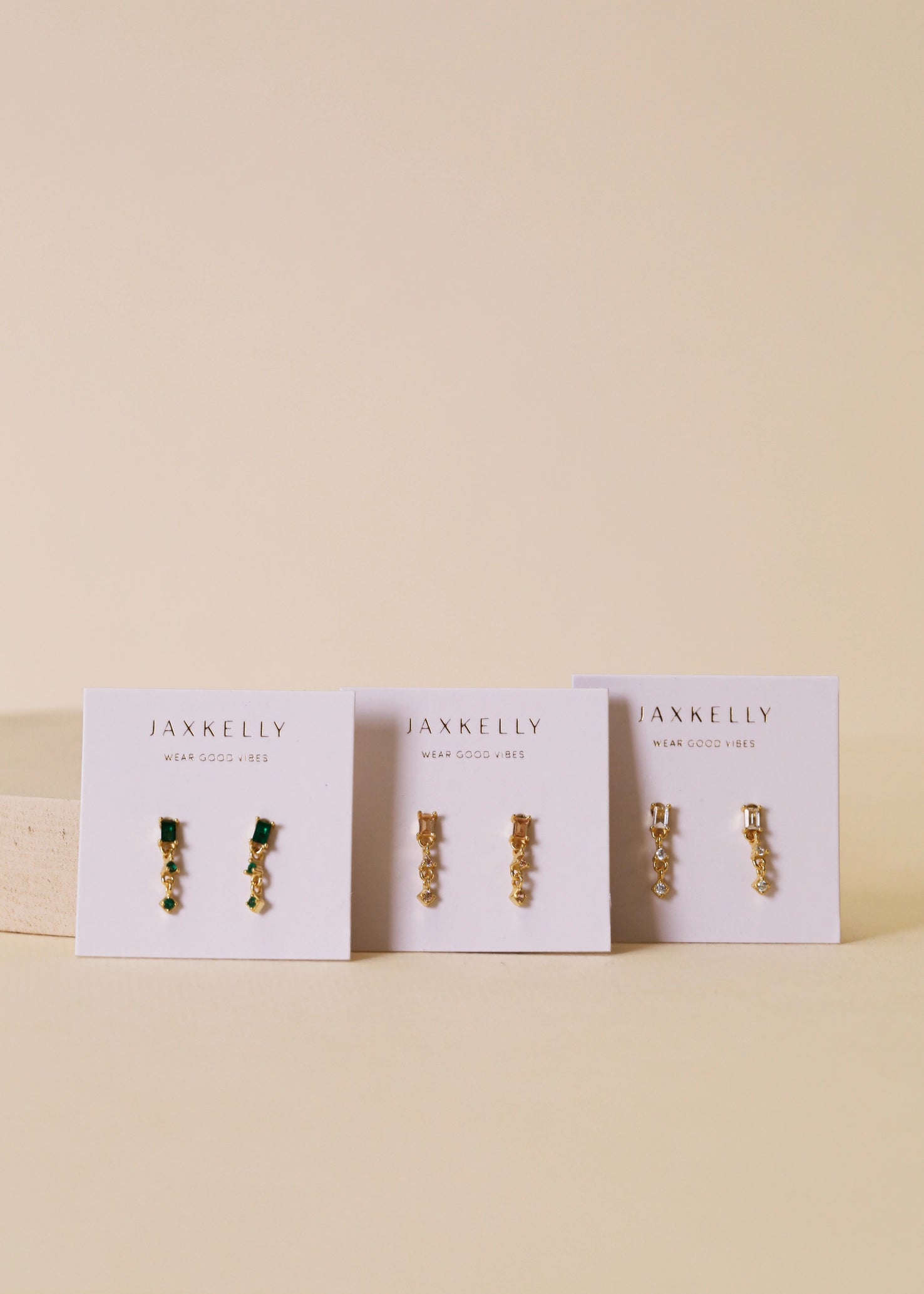 Just a touch of color. Delicate CZ stones hang from a chain anchored to a baguette set stud. Thoughtfully crafted Sterling Silver Posts – 18K gold plating over brass Hypoallergenic – Lead Free Tarnish Free - Long lasting protective coating safeguarding your jewelry from sweat, water, and more. Champagne CZ stones