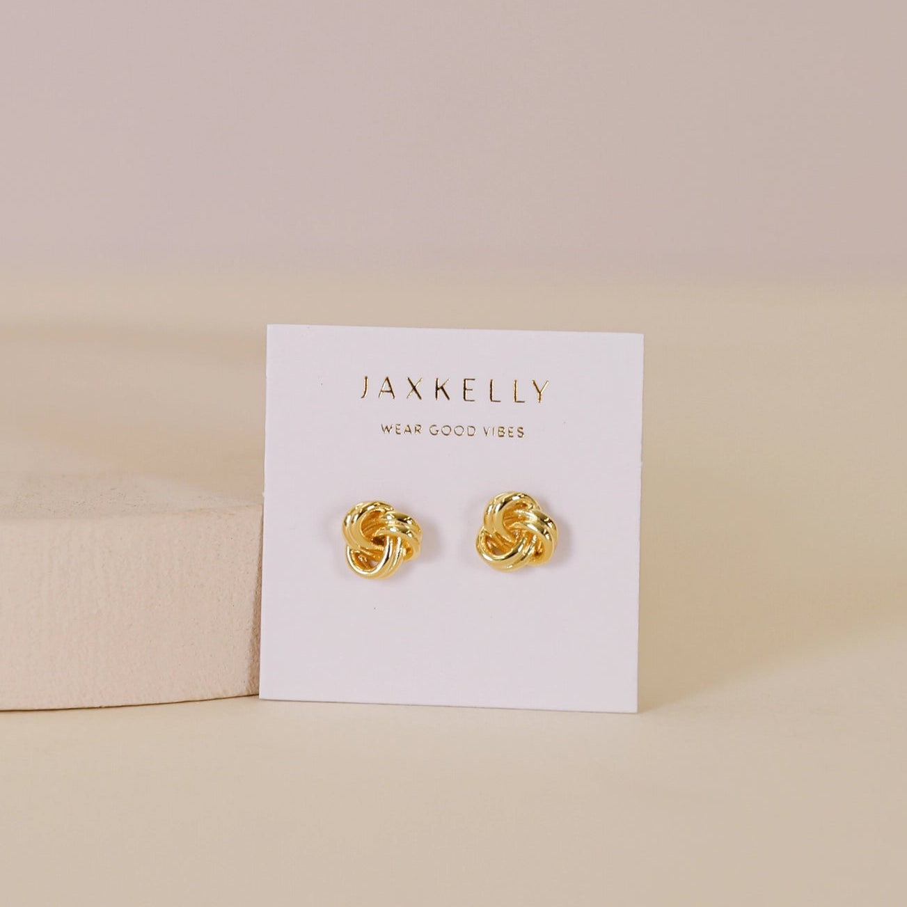 A timeless petite gold knot stud, perfect for effortless everyday wear. Tarnish Free - Long lasting protective coating safeguarding your jewelry from sweat, water, and more. Sterling Silver Posts – 18K gold plating over brass Hypoallergenic – Lead Free