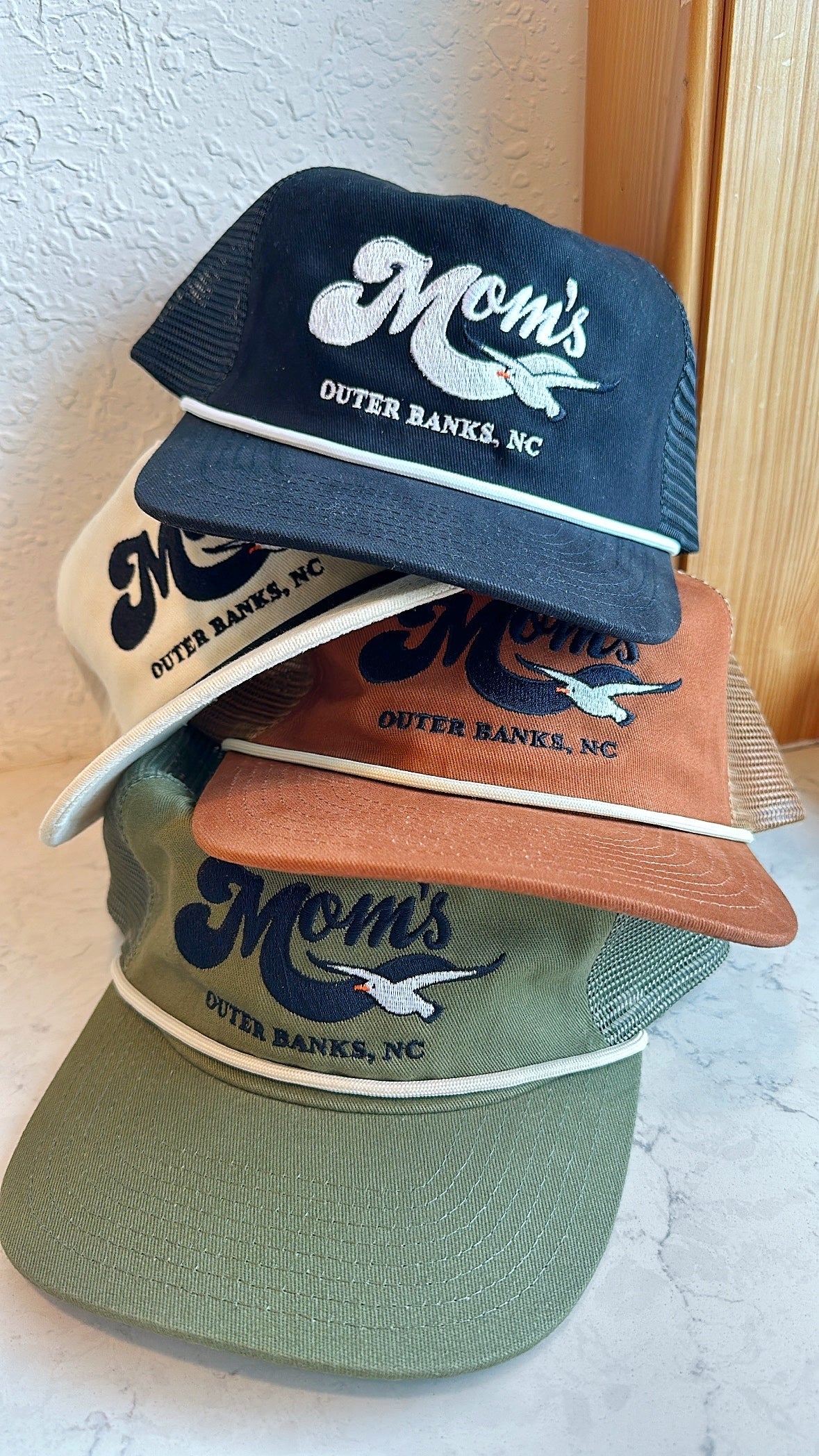 A brushed cotton canvas & mesh trucker style snapback with embroidery on front featuring the Mom's Bubble & Seagull logo, with rope trim accent on brim. Hats are locally embroidered on the Outer Banks!