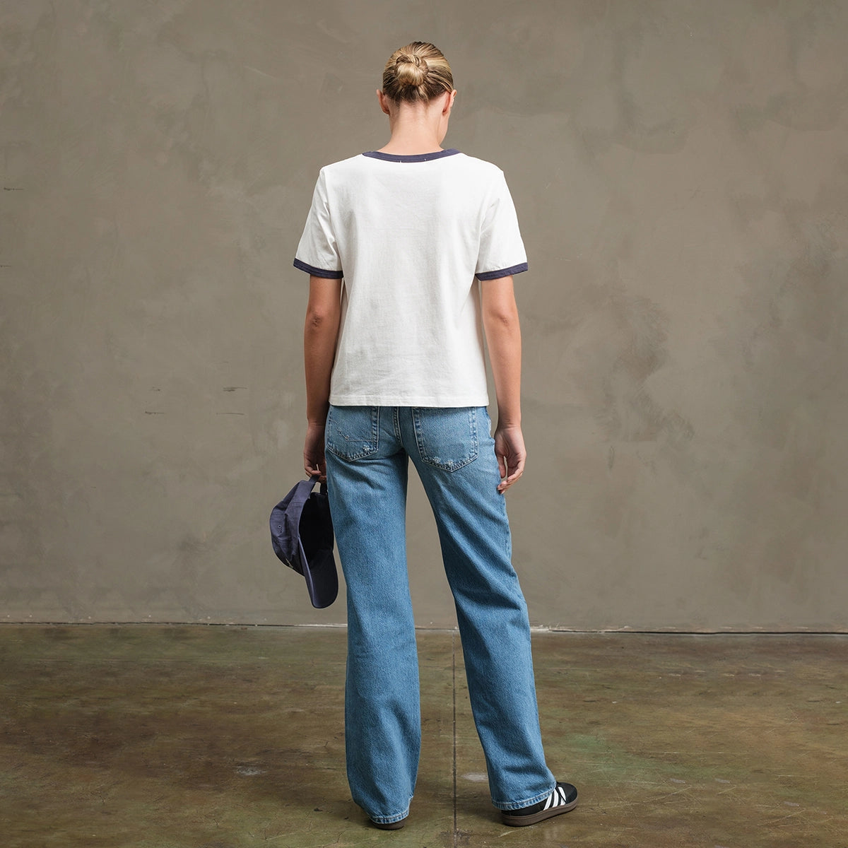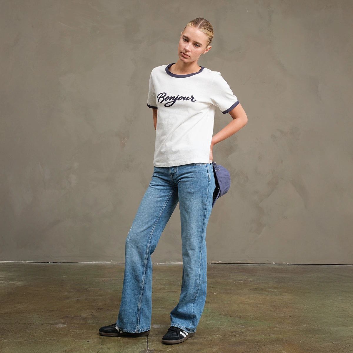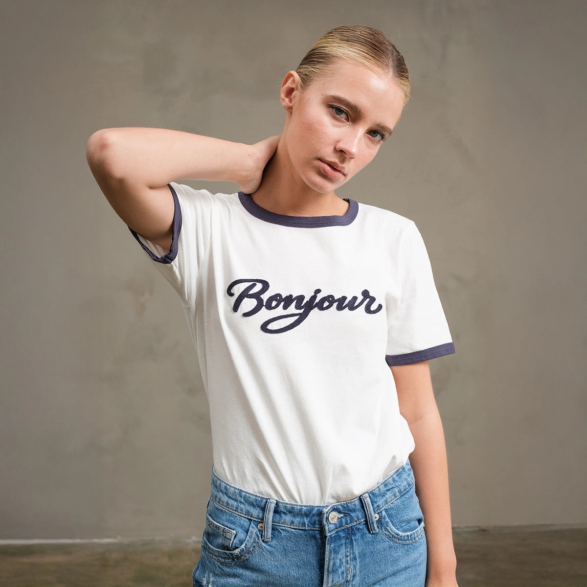 Add a playful French twist to your casual wardrobe with this “Bonjour” ringer tee. Crafted from soft cotton, it features contrast ribbed trim at the neckline and sleeves for a sporty, retro feel. Perfect for pairing with jeans, shorts, or skirts for an effortlessly chic look. -Embroidered "Bonjour" lettering at front -Contrast binding on neck and sleeve hems -Regular fit 100% Cotton